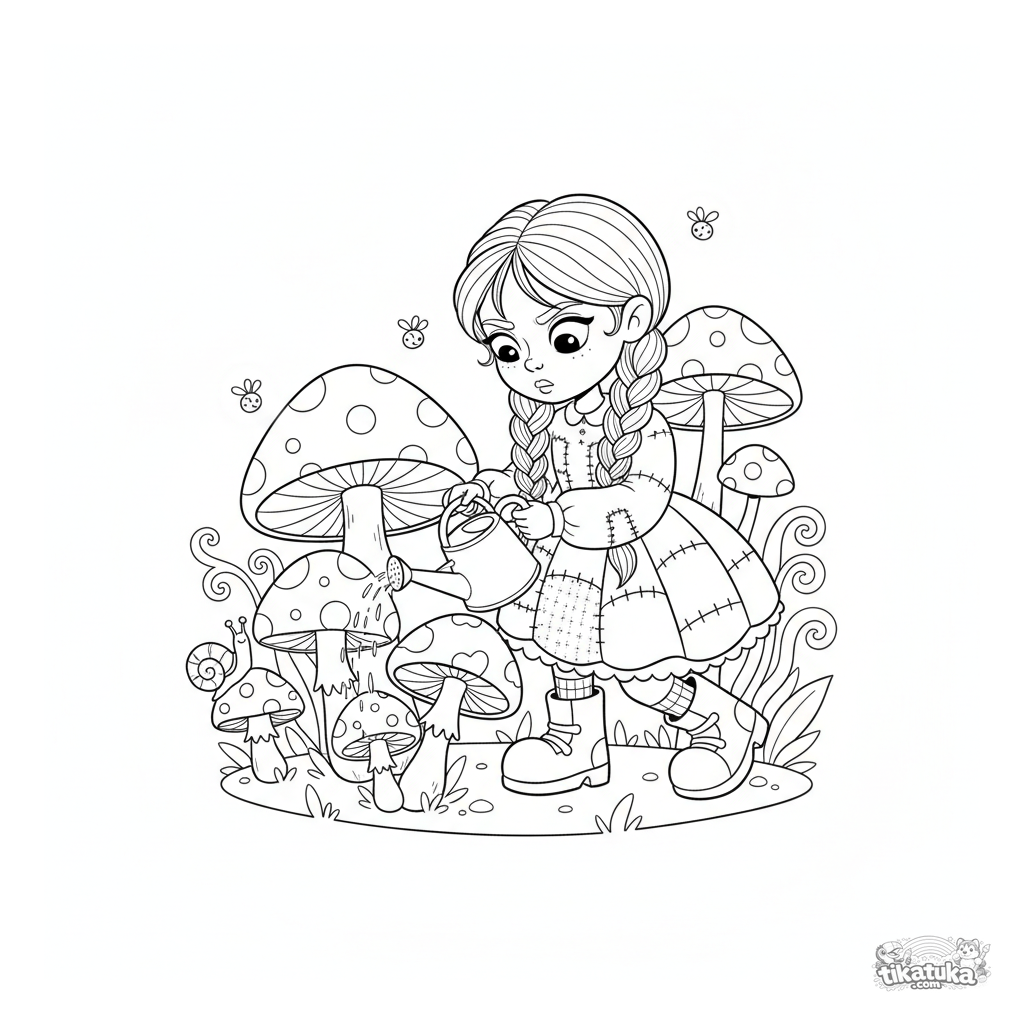 Página para colorear de una niña en un vestido de retazos cuidando hongos gigantes mágicos con una regadera. Para niños de 5-8 años.