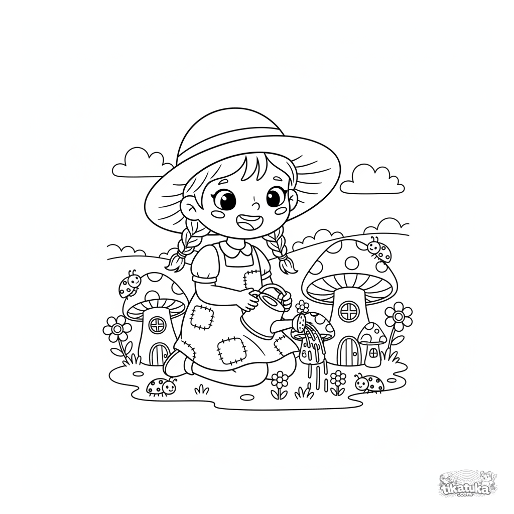 Página para colorear para niñas de 4-6 años: una niña alegre en vestido riega casas de hongos mágicas. Una escena de cuento de hadas con detalles simples.
