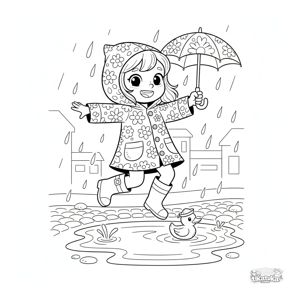 Página para colorear para niñas: una niña alegre en impermeable saltando en charcos. Para niños de 3 a 6 años. Incluye paraguas, pato de goma y gotas de lluvia. Cuerpo completo, márgenes amplios.