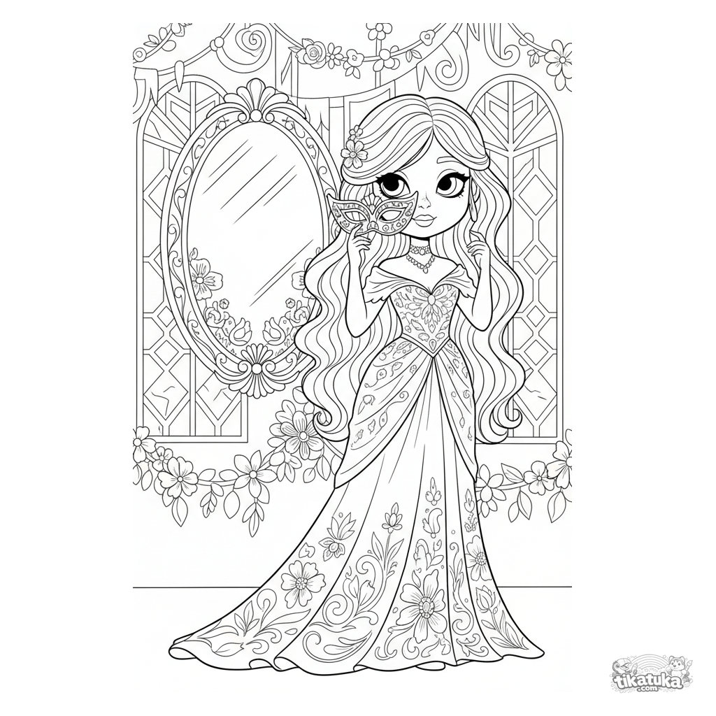 Página para colorear intrincada estilo art nouveau para niños mayores 10-12: una niña con máscara frente a un espejo en un salón festivo. Escena decorativa.
