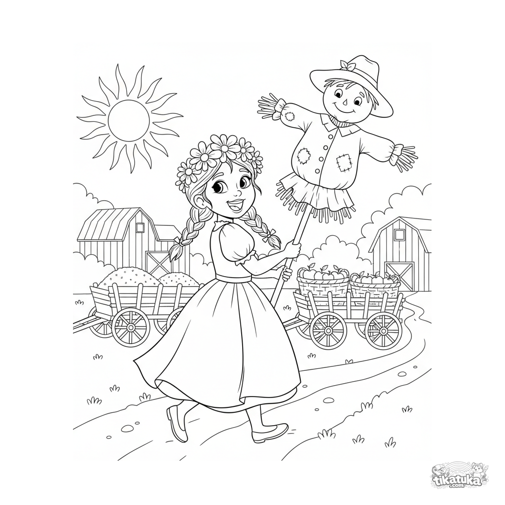 Página para colorear para niños 4-6 años: una niña con corona de flores guía un espantapájaros alegre durante un desfile de cosecha. Escena folclórica otoñal.