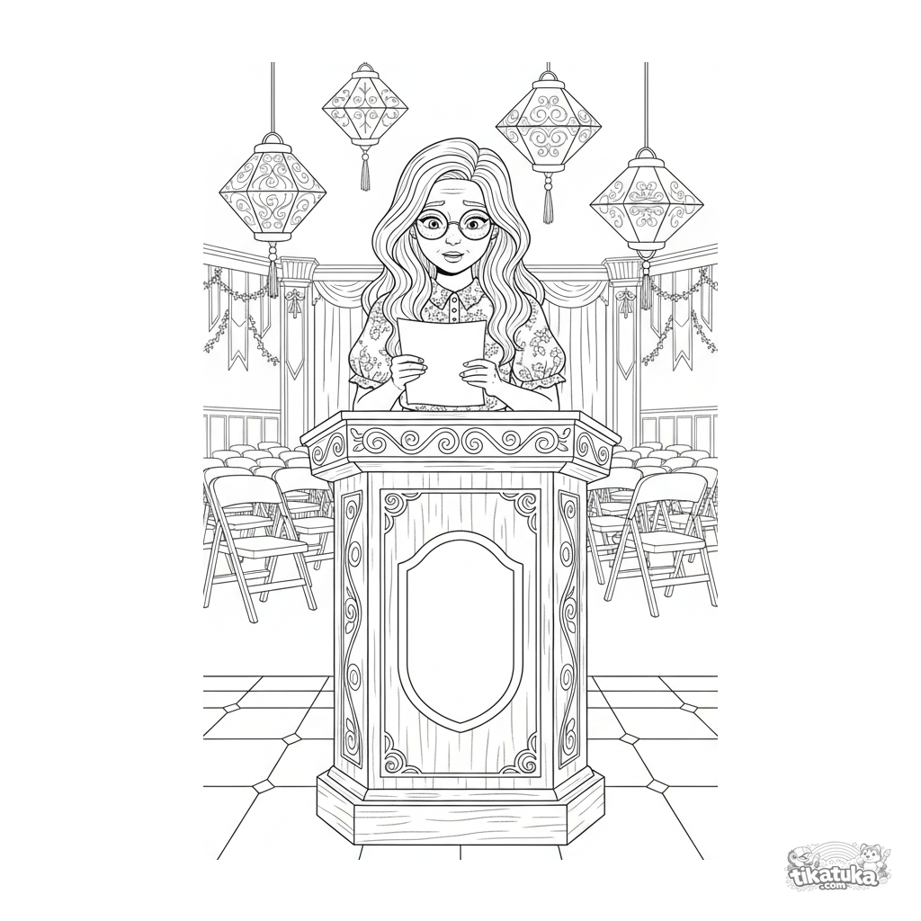 Página detallada para colorear para niños mayores 10-12: una niña con gafas lee un poema desde un atril en un salón festivo decorado.
