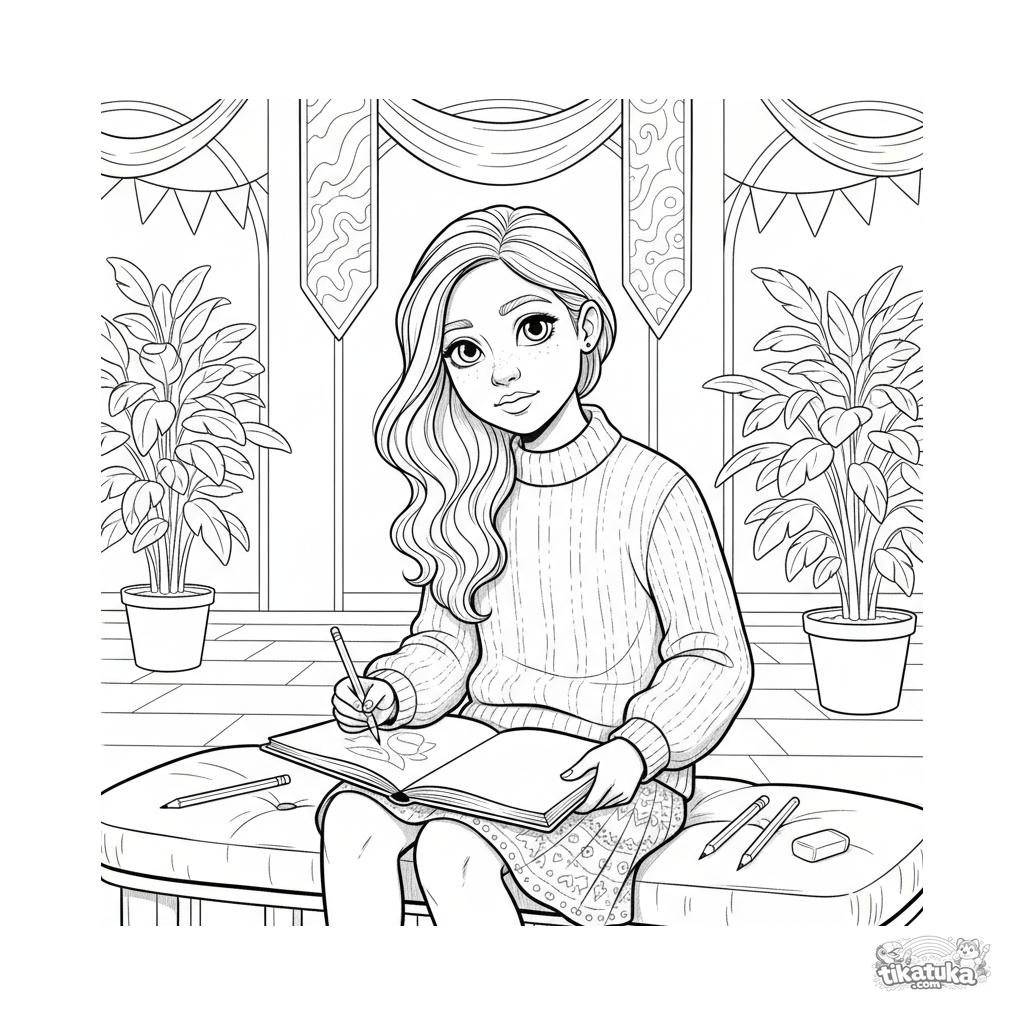 Página para colorear para preadolescentes 7-9: una niña sentada en un banco en un salón festivo dibuja ideas de decoración en un cuaderno.