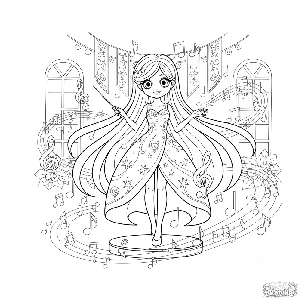 Página para colorear para niñas 7-9: una niña mágica en un salón festivo dirige, haciendo que notas musicales floten a su alrededor. Escena de fantasía con música.