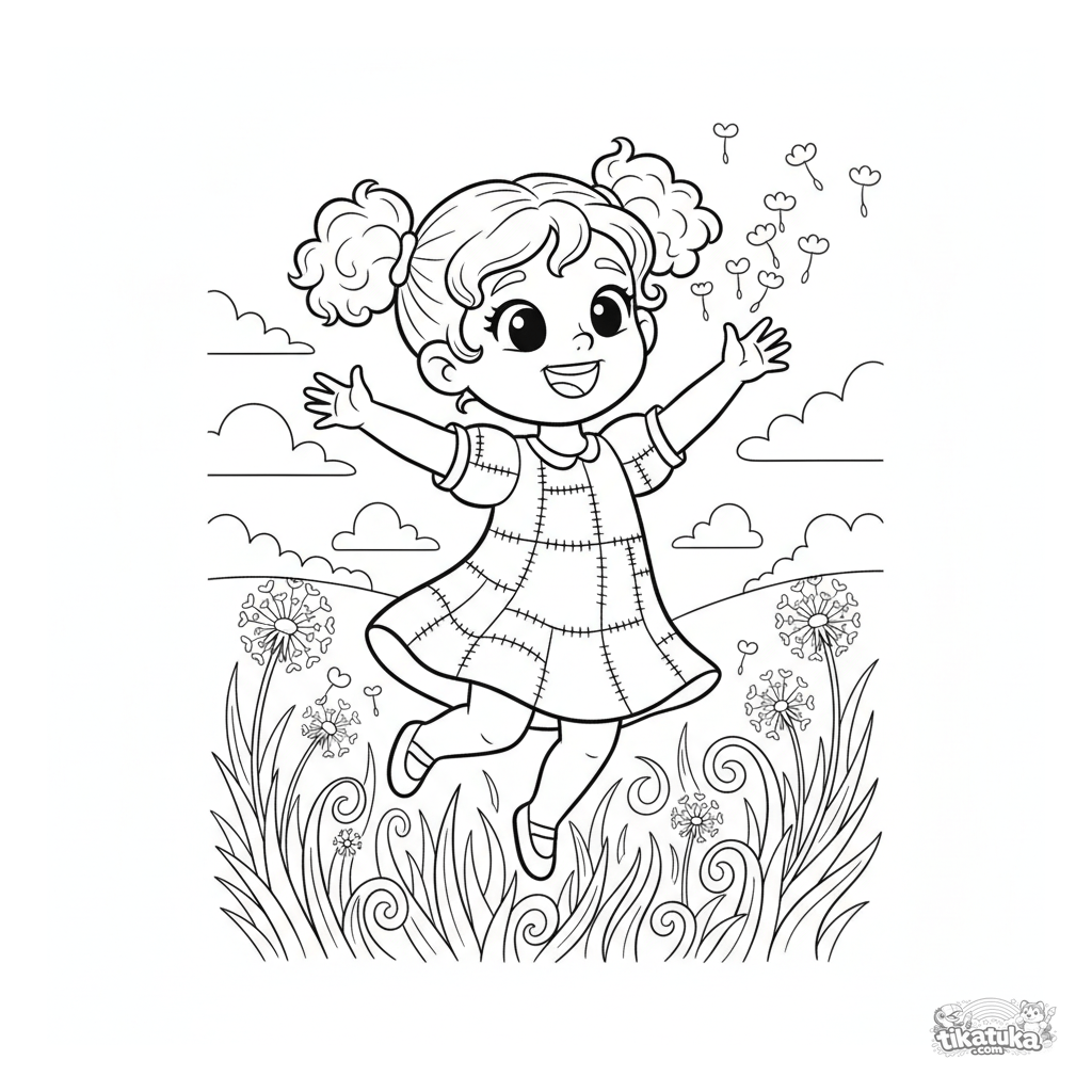 Página para colorear para niñas: una niña alegre en vestido de retazos corre por un prado atrapando semillas de diente de león. Para niños de 4 a 6 años.