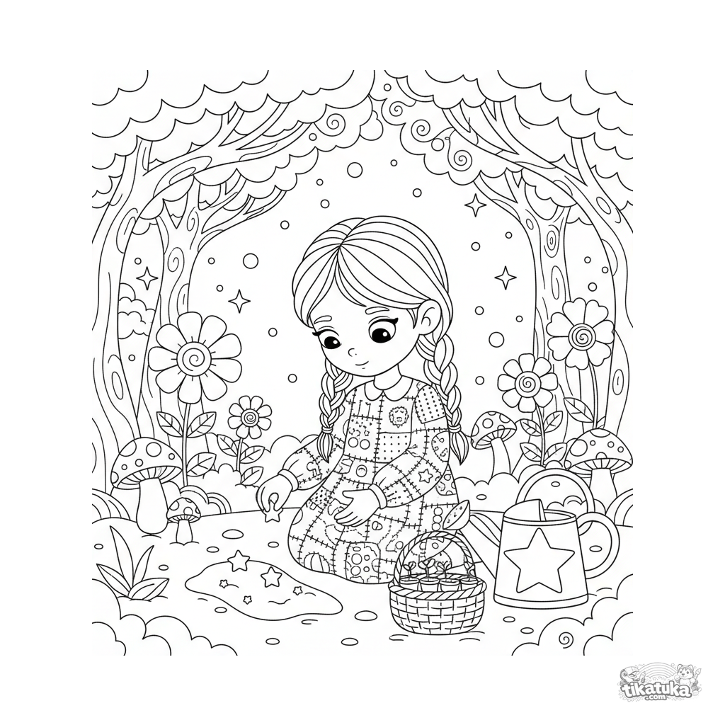 Página para colorear de una niña con vestido de retazos plantando semillas mágicas en una arboleda encantada. Para niños de 5 a 8 años.