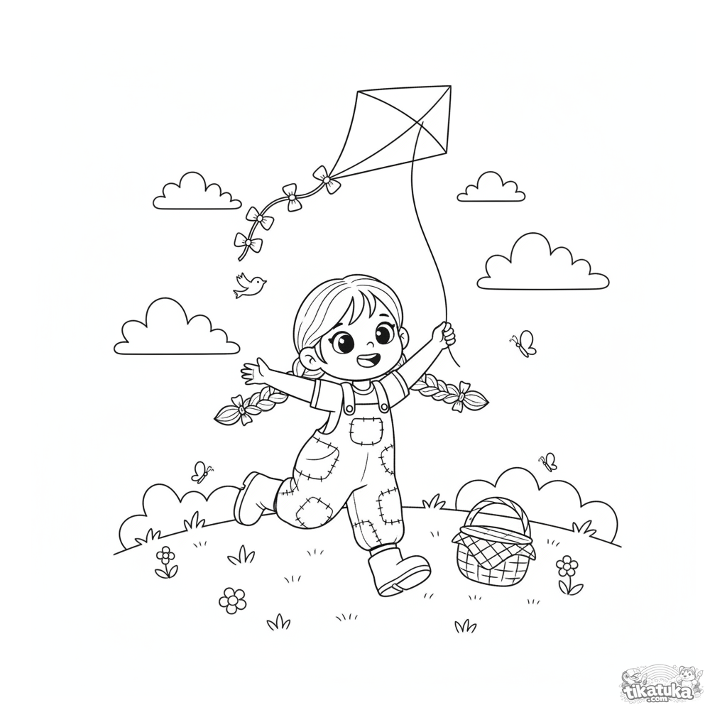 Página para colorear para niñas: una niña alegre en overol vuela una cometa en una colina. Para niños de 3 a 6 años. Estilo cartoon.