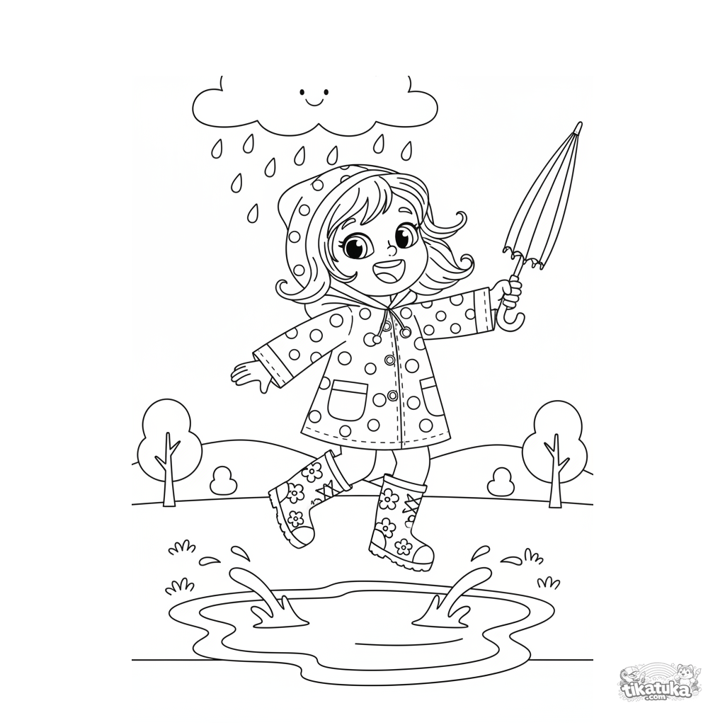 Página para colorear para niños: una niña feliz con impermeable salta en un charco. Detalle equilibrado, para 4-6 años.