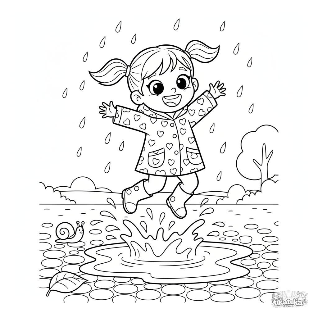 Página para colorear de una niña alegre en impermeable saltando feliz en charcos de lodo. Para niños de 4 a 6 años.