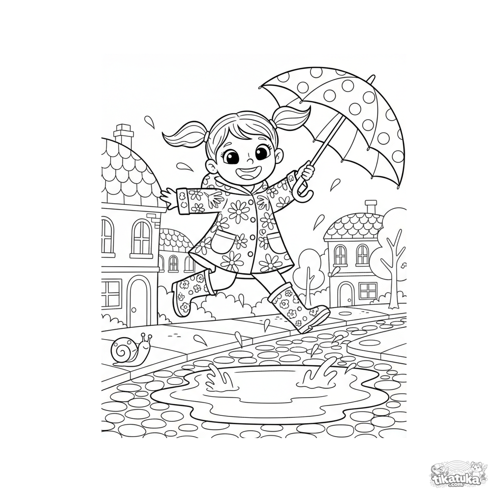 Página para colorear para niñas: una niña alegre con impermeable salta en un charco con paraguas. Para niños de 3 a 6 años. Escena brillante y sencilla.