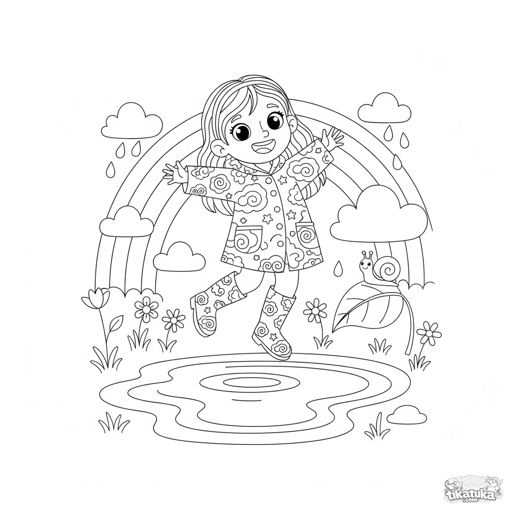 Página para colorear de una niña alegre en impermeable saltando en charcos bajo un arcoíris. Página fácil y colorida para niñas de 3 a 6 años.
