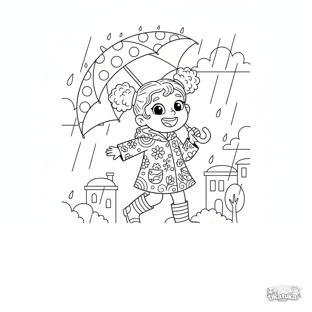 Página para colorear de una niña feliz con impermeable saltando en charcos con paraguas. Para niños de 3 a 6 años.