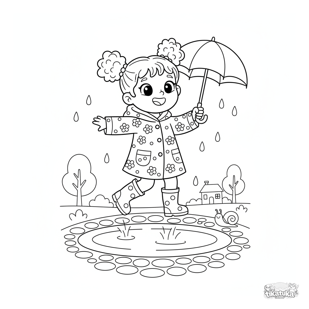 Página para colorear para niñas: una niña alegre con impermeable saltando un charco. Para niños de 4-6 años. Escena dinámica con ambiente alegre.