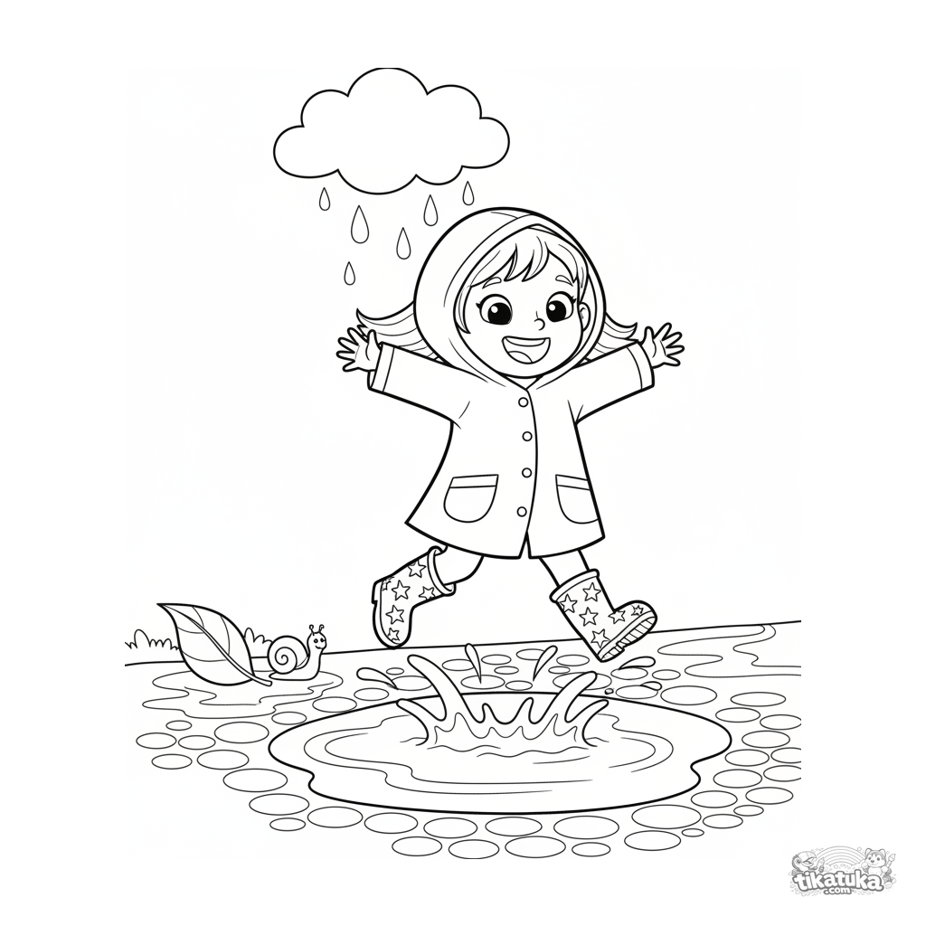 Página para colorear de una niña feliz con impermeable saltando en charcos. Para niñas de 3 a 6 años.
