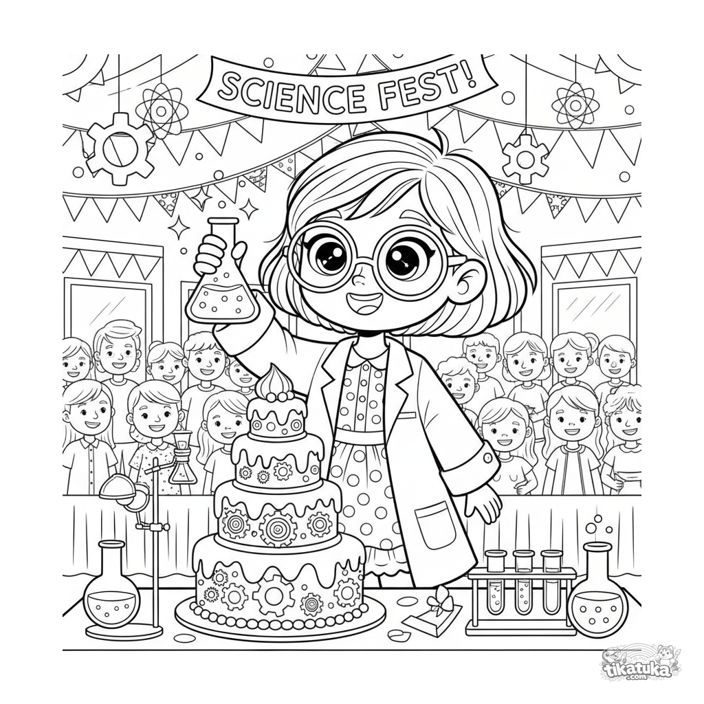 Página detallada para colorear para niñas 10-12 años: una joven científica presenta su experimento de pastel en una feria festiva. Muchos elementos para colorear.