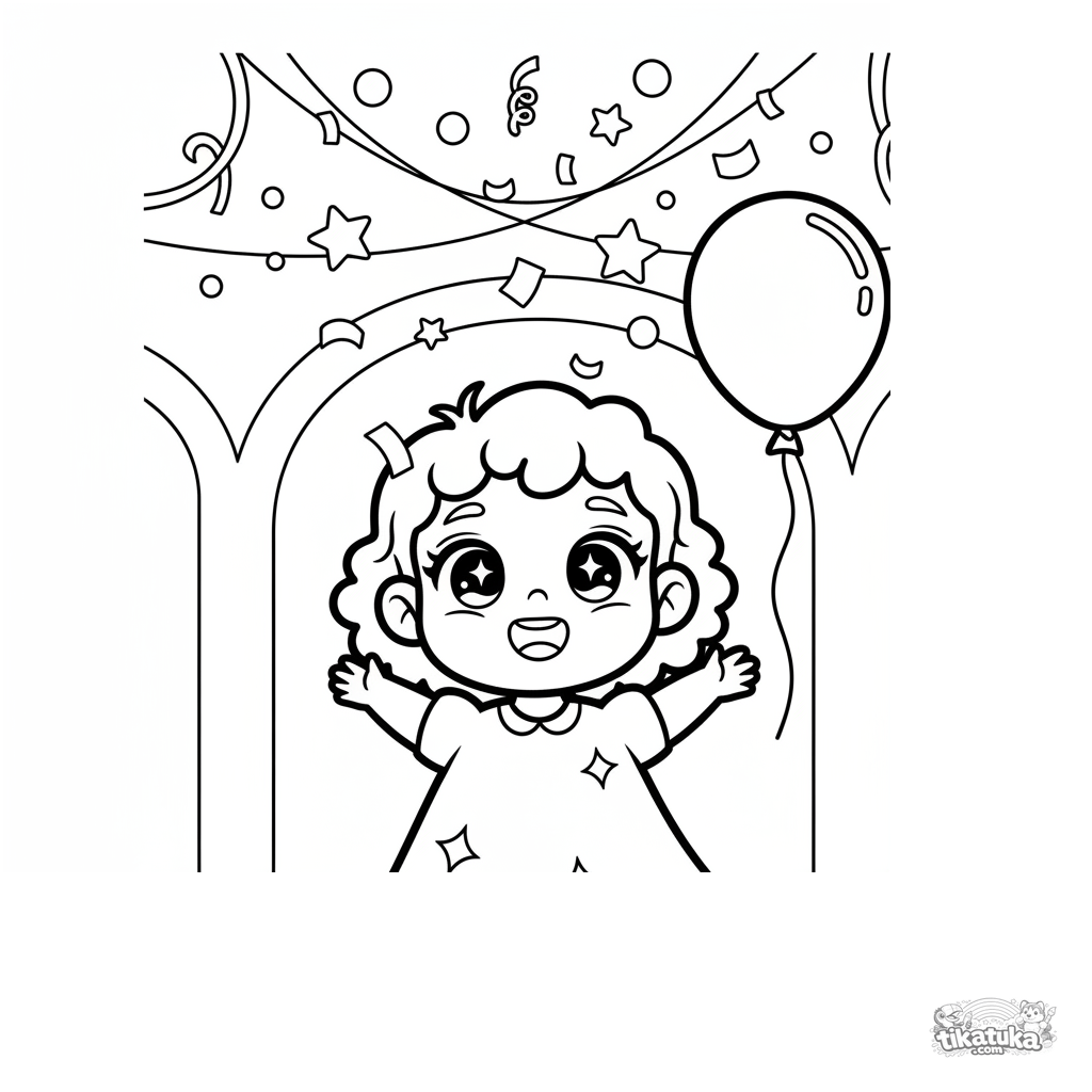 Página para colorear para niños pequeños 2-3: una niña con brillos mira confeti cayendo. Formas simples enormes, mínimo detalle.