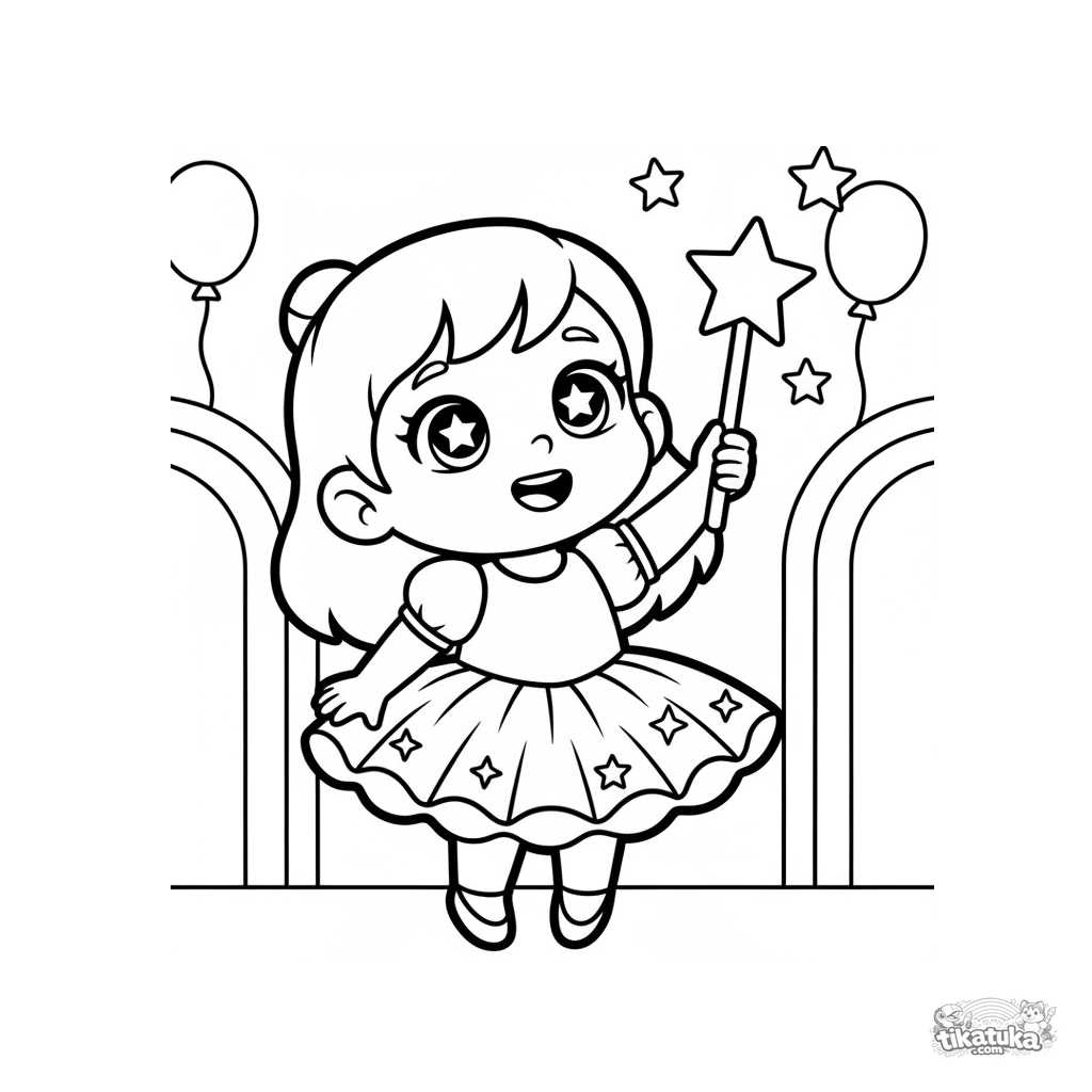 Página simple para colorear para niños pequeños 2-3 años: una niña con vestido tutú brillante se pone de puntillas sosteniendo una varita mágica en un salón de fiestas. Formas grandes con estrellas flotantes.