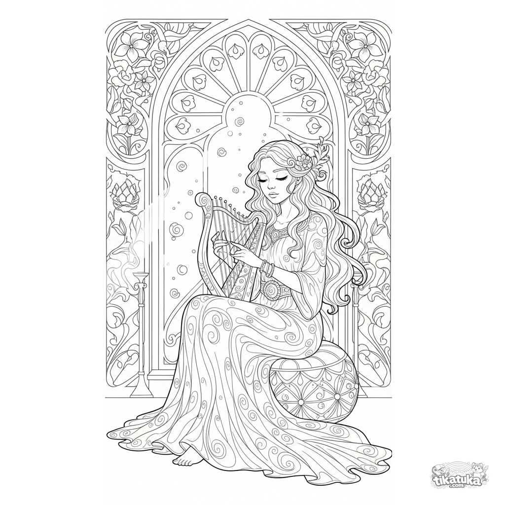 Página para colorear detallada estilo Art Nouveau para niñas 10-12: una niña toca un arpa junto a una ventana en un salón festivo. Líneas fluidas, elementos decorativos.