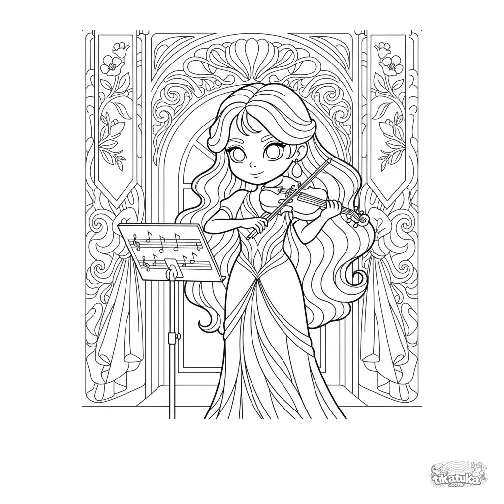 Página para colorear para niños de 4-6 años: una niña toca el violín en un salón festivo decorado, con un atril a su lado. Contornos claros, márgenes amplios.