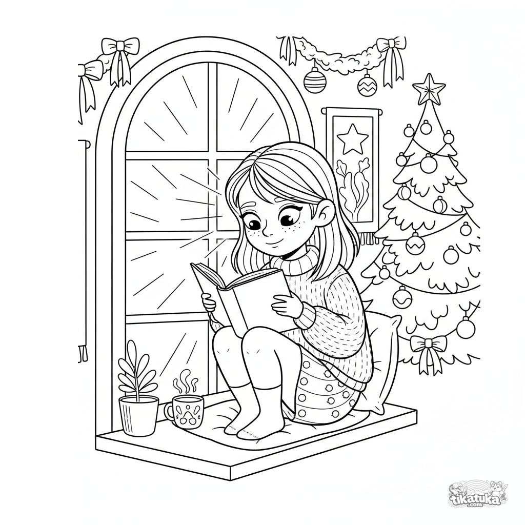 Página para colorear para niñas 7-9 años: una niña con suéter cómodo lee un libro en un rincón acolchado de ventana dentro de un salón festivo. Taza y planta en el alféizar.