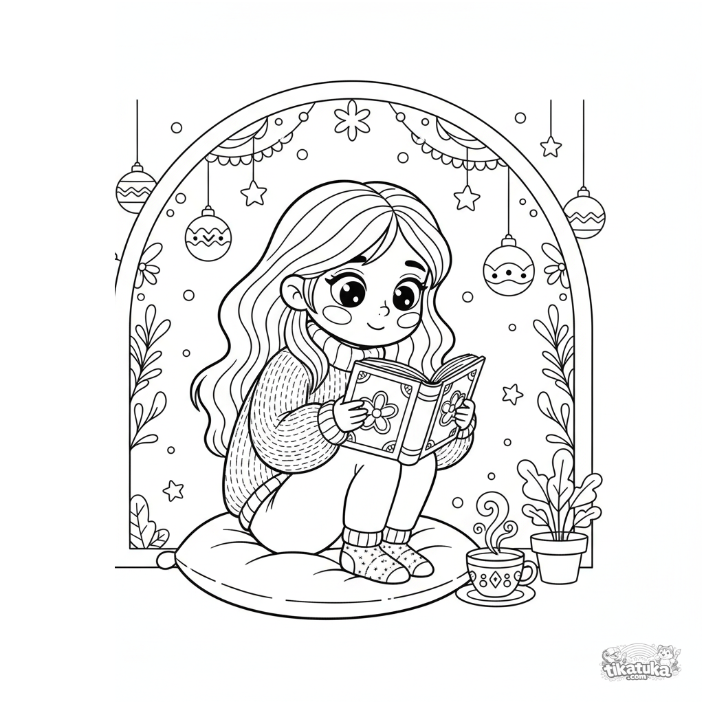 Página para colorear para niños de 7-9 años: una niña con suéter cómodo disfruta leyendo un libro grande acurrucada en un cojín en un salón festivo. Cuerpo completo visible.