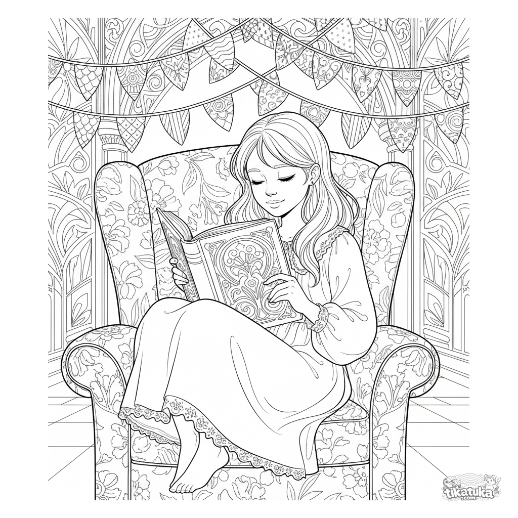 Página para colorear detallada para 10-12 años: una niña leyendo un libro gigante en un sillón acogedor en medio de un salón festivo. Ornamentos, pliegues de ropa, figura completa, contornos intrincados.