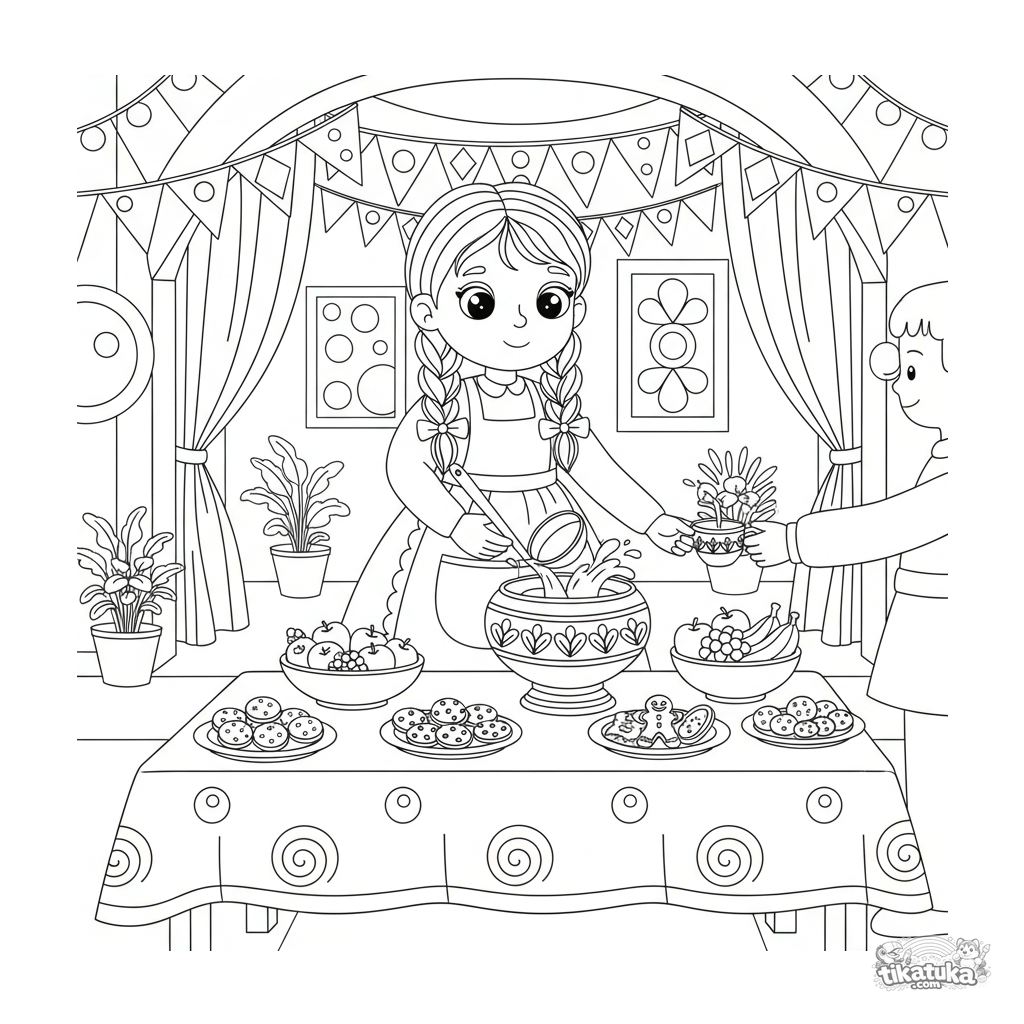 Página para colorear para niños 4-6: una niña con delantal sirve ponche en un salón festivo. Formas claras, acción comprensible.