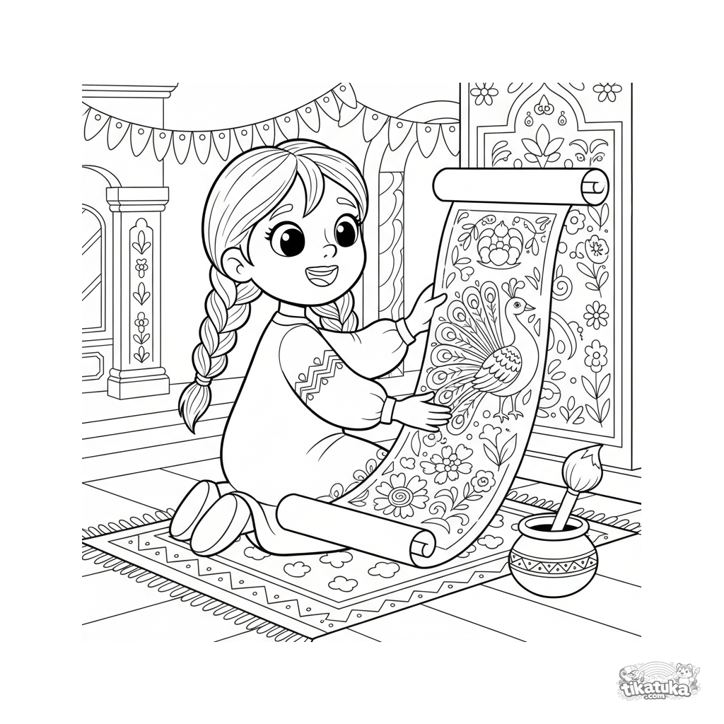 Página para colorear para niños de 7 a 9 años: una niña con estilo folclórico desenrolla un rollo decorativo largo. Detalles con patrones.