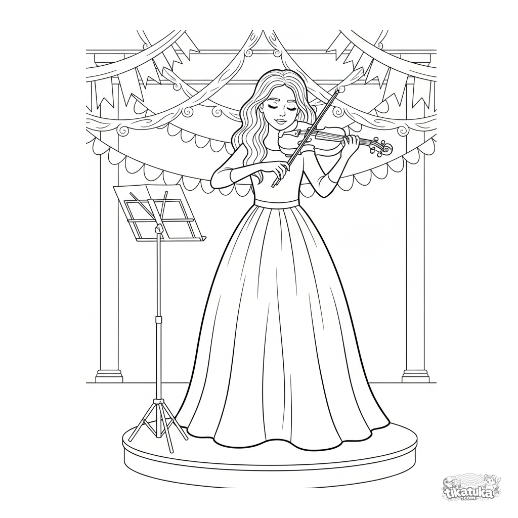 Página para colorear para niños 7-9: una niña tocando el violín en un podio en un salón festivo. Escena con partituras y decoraciones.