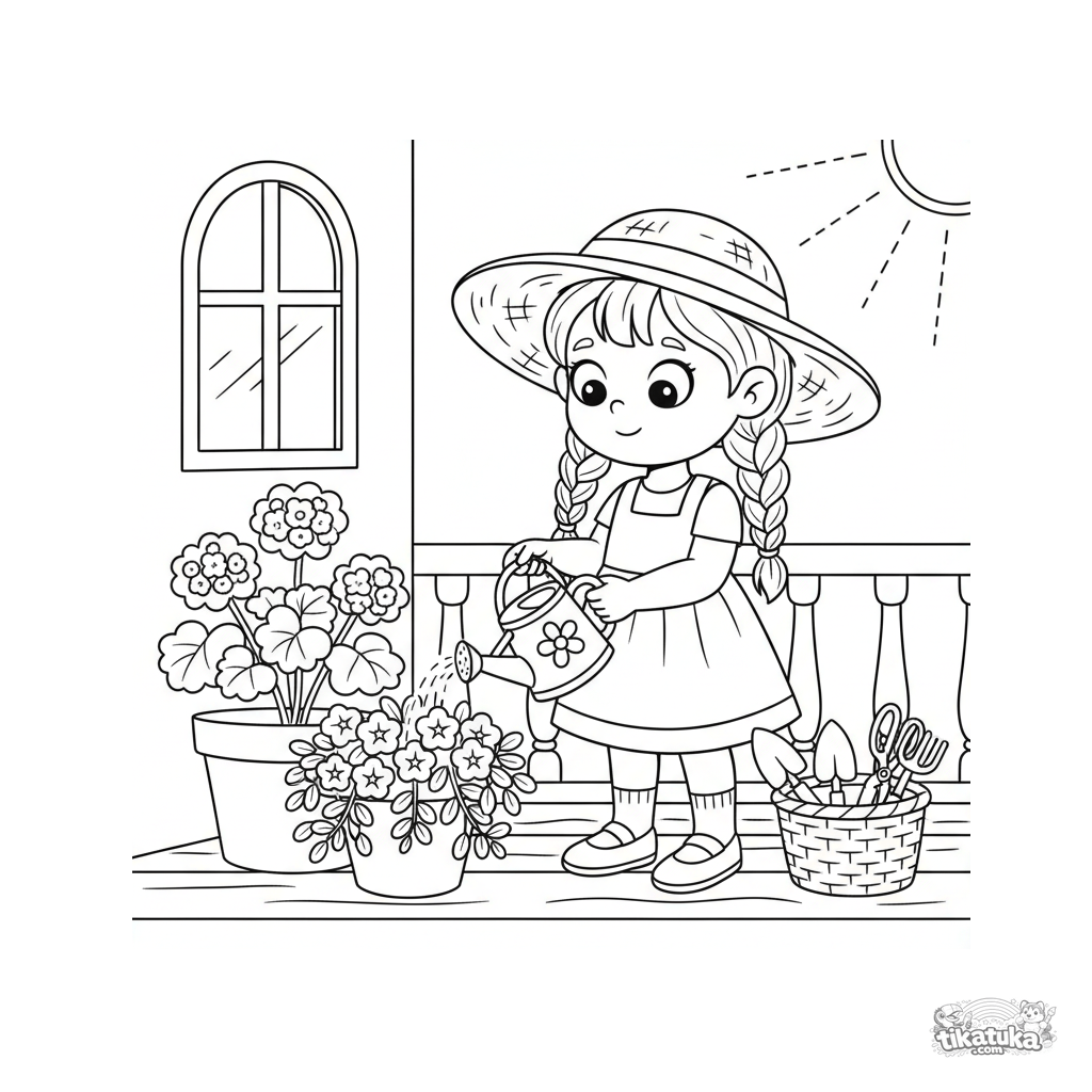 Página para colorear para niños: una niña riega plantas en un porche de dacha soleado. Detalle equilibrado para 4-6 años.