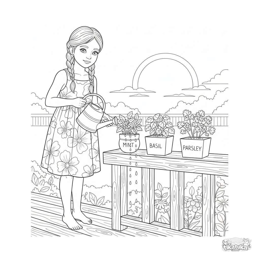 Página detallada para colorear para niños 10-12 años: una niña riega hierbas en macetas en la barandilla de un porche. Líneas claras, detalles naturales.