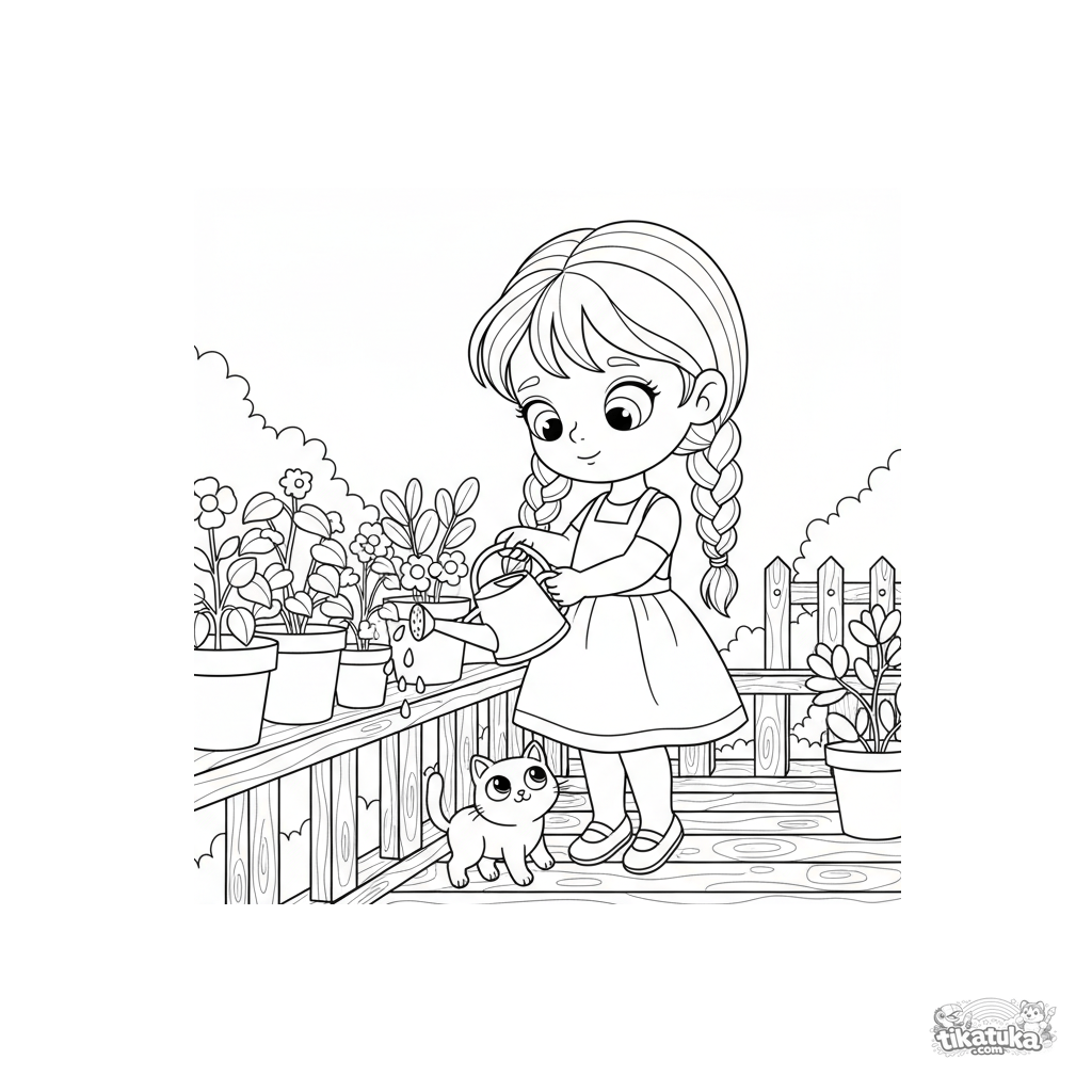 Página para colorear para niños 4-6: una niña con trenzas riega plantas en macetas en la barandilla de una terraza.