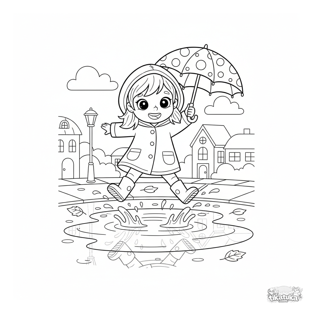 Página para colorear para niñas: una niña feliz con impermeable salta en charcos con paraguas. Para niños de 4 a 6 años. Figura completa, márgenes amplios, ánimo alegre.