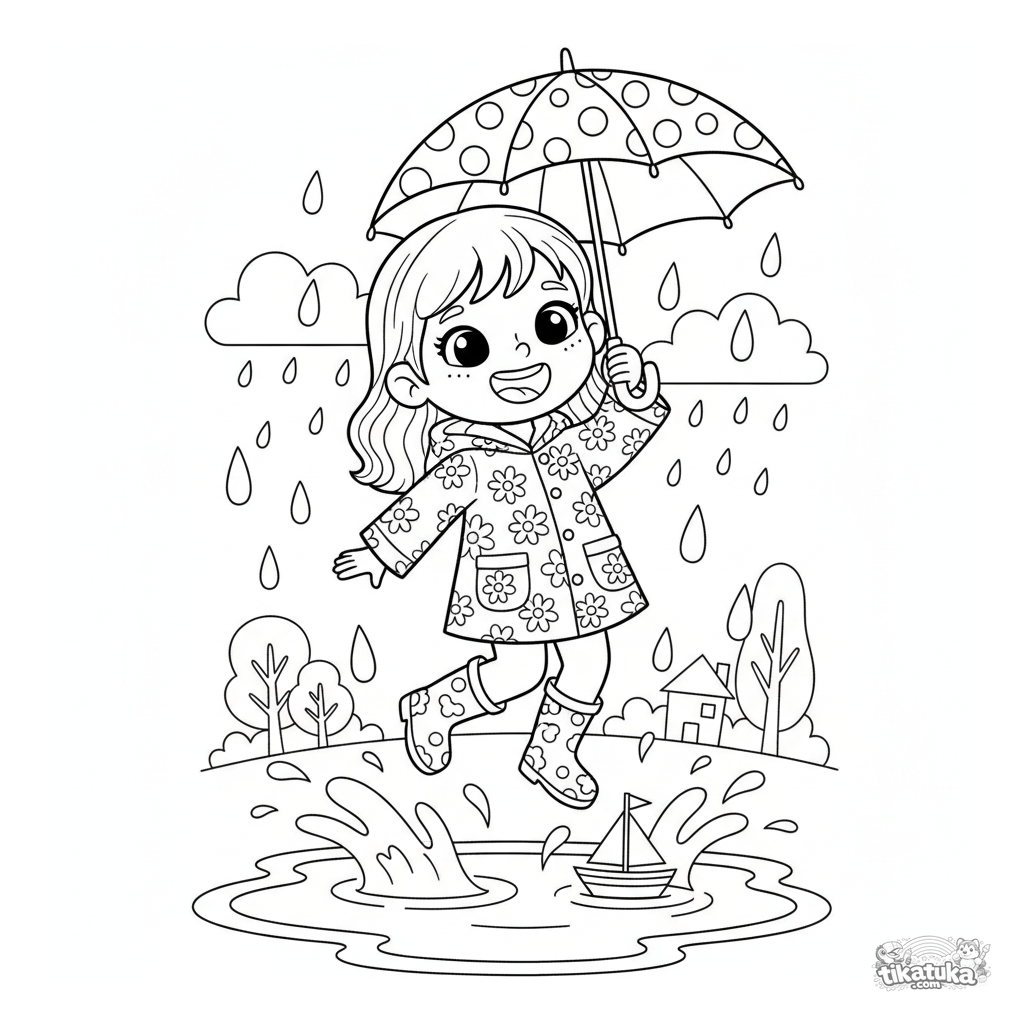 Página para colorear de una niña feliz con impermeable saltando en un charco bajo un paraguas. Para niñas de 3 a 6 años.