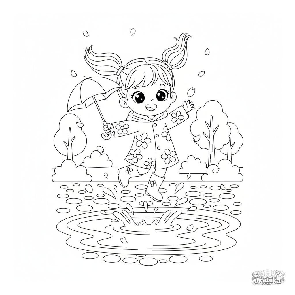 Página para colorear para niñas: una niña alegre con impermeable salta sobre charcos de primavera con pétalos de flor de cerezo. Escena brillante y dinámica para niños de 4 a 6 años.
