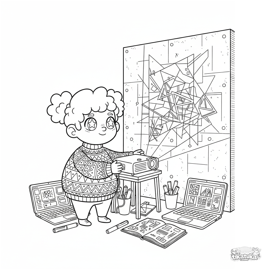 Página para colorear para niños de 10-12 años: un artista digital crea arte glitch con un proyector en un sótano. Escena llena de detalles creativos.