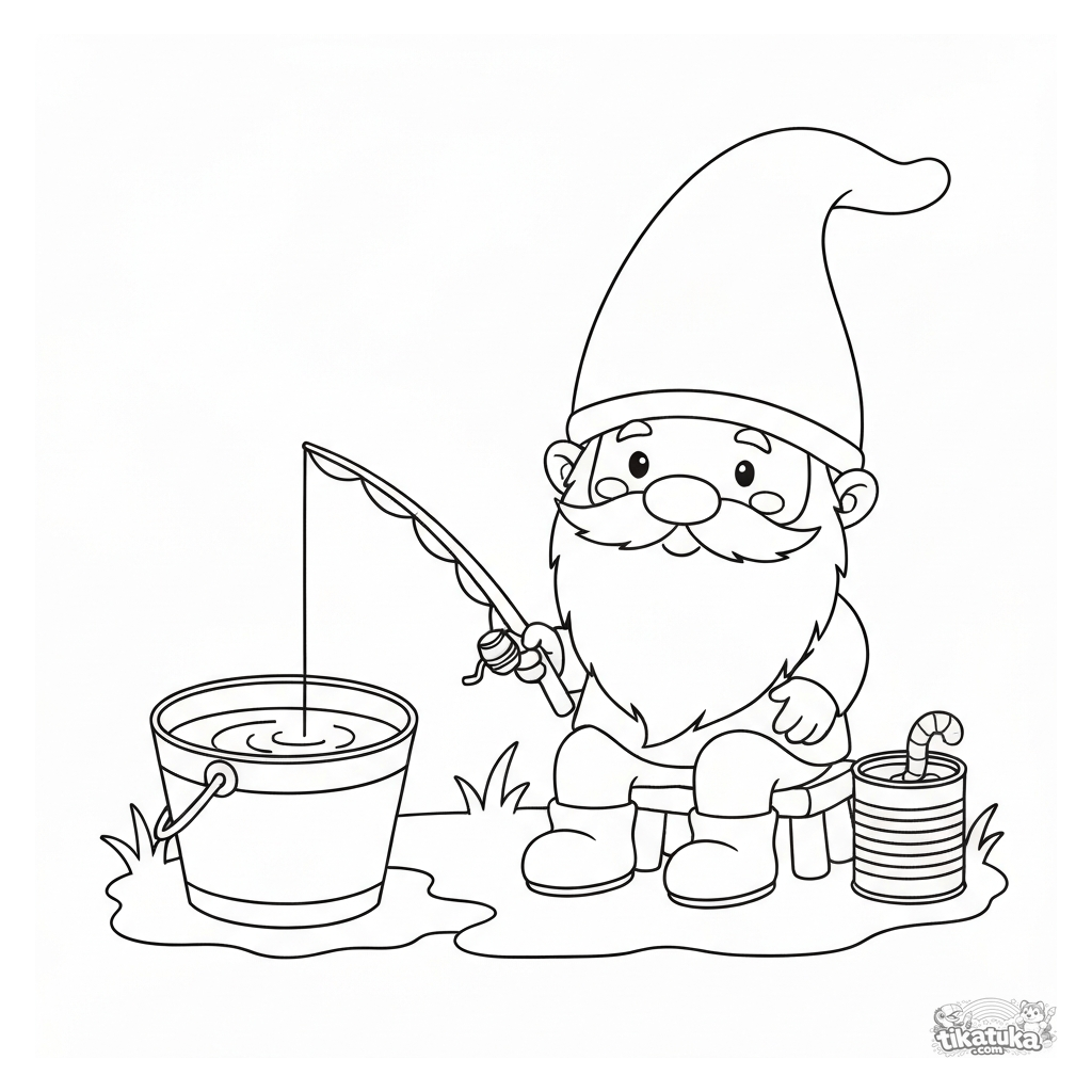 Página para colorear divertida para niños: un gnomo alegre con caña de pescar pesca en un estanque cubo. Sentado en un taburete, lata de gusanos cerca.
