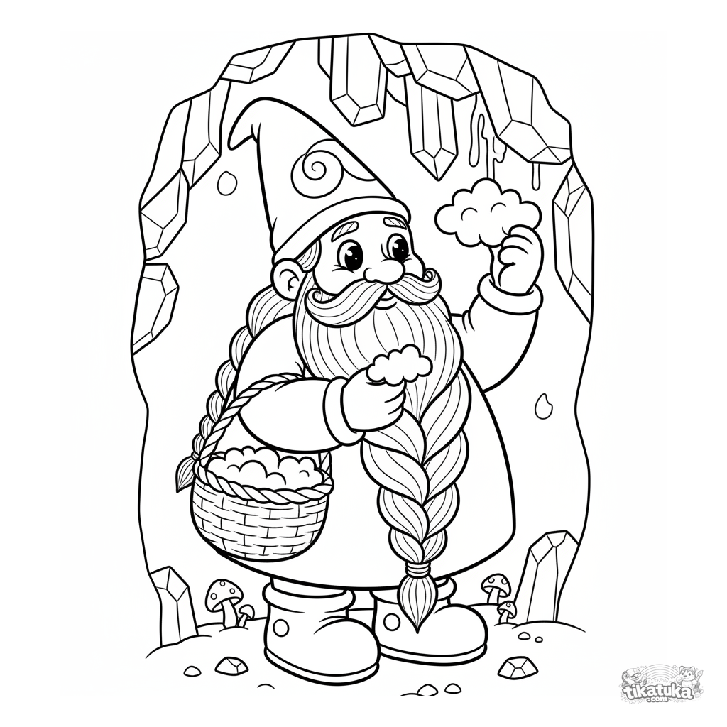 Página para colorear para niños 4-6: un gnomo herbolario recolecta musgo brillante en una cueva de cristal mágica. Escena de fantasía adorable.