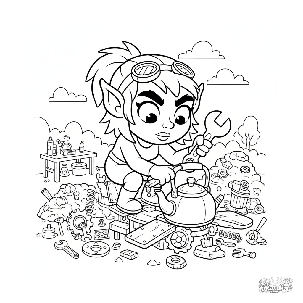 Página para colorear para niños 7-9: un ingenioso ingeniero trasto retoca una máquina voladora hecha de chatarra en su taller de chatarrería.