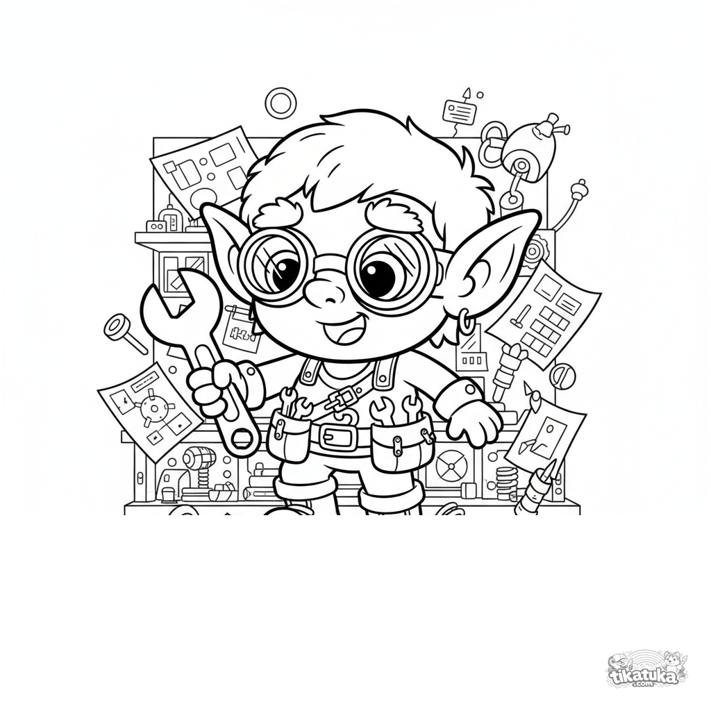 Página para colorear para niños 4-6: un duende inventor en su taller probando sus nuevas botas voladoras. Escena divertida y dinámica.