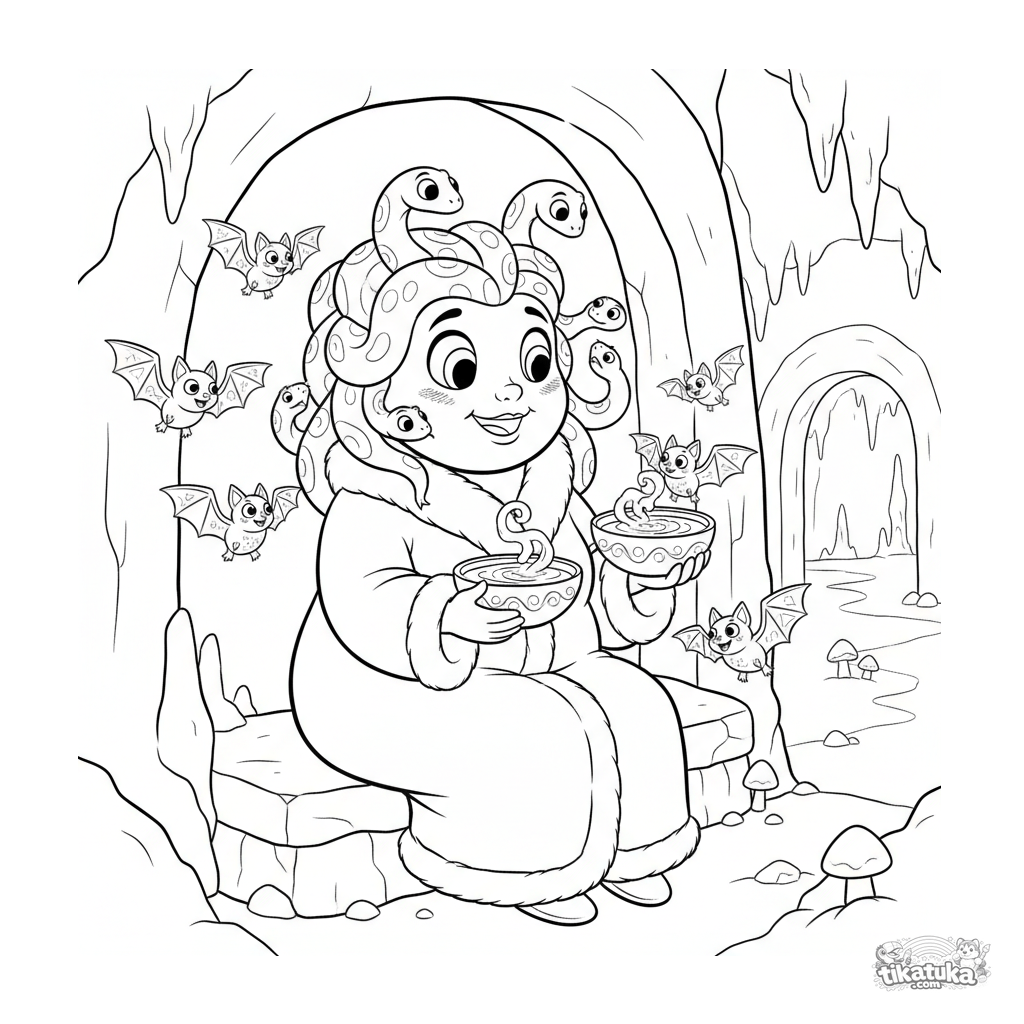Página para colorear para niños 7-9 en estilo clásico: Una Gorgona amable cuida de sus mascotas, murciélagos de cristal, en un rincón acogedor de su guarida.