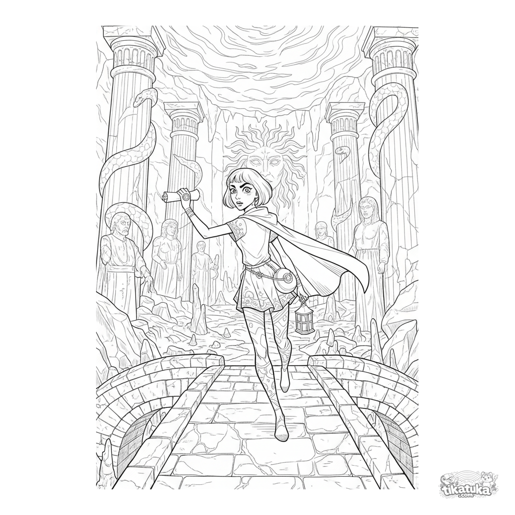 Página para colorear estilo grabado para niños 10-12: un mensajero con pergamino en un puente de piedra en la guarida de la Gorgona.