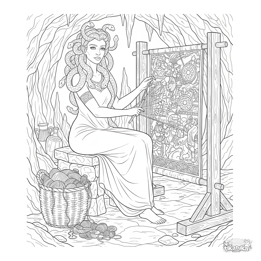 Página compleja para colorear para niños 10-12: la Gorgona inmortal Esteno teje un tapiz en la guarida de piedra. Líneas detalladas, estilo grabado antiguo, tema mitología.