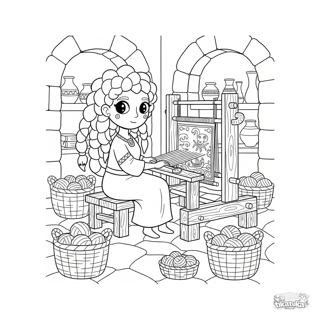 Página para colorear para niños de 4-6 años: una de las hermanas Gorgona trabajando en un telar en la guarida de piedra. Estilo folclórico brillante, formas claras.