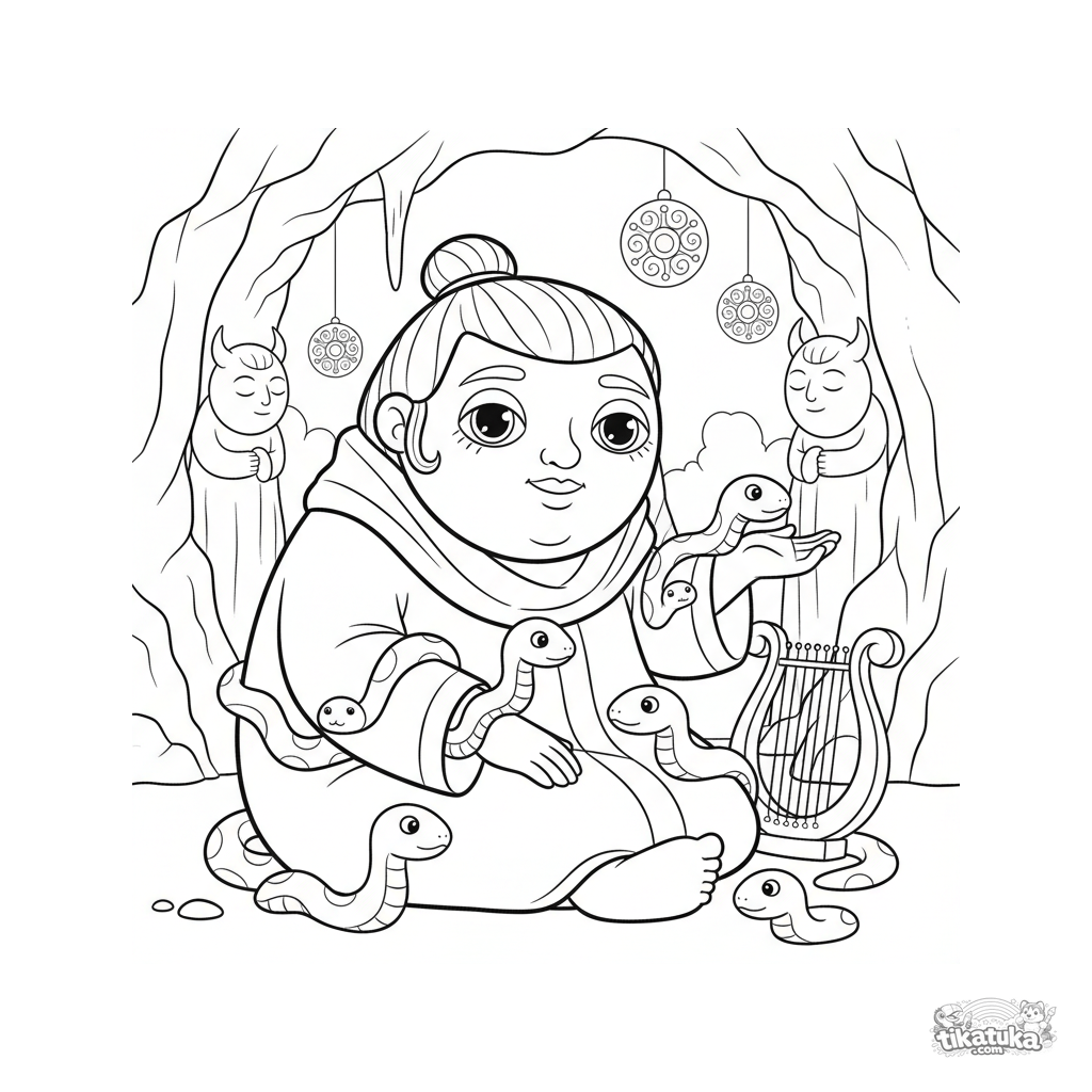 Página para colorear para niños 7-9: Un domador de serpientes en la guarida de Medusa Gorgona. Escena en estilo folklórico con arpa y serpientes tranquilas.