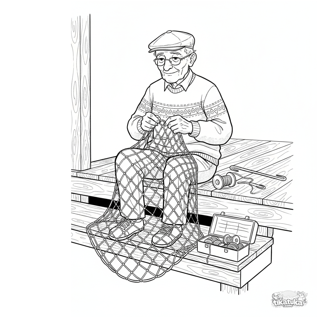 Página detallada para colorear para niños mayores 10-12 años: un abuelo remendando una red de pesca sentado en el escalón del porche. Texturas complejas y atmósfera tranquila.
