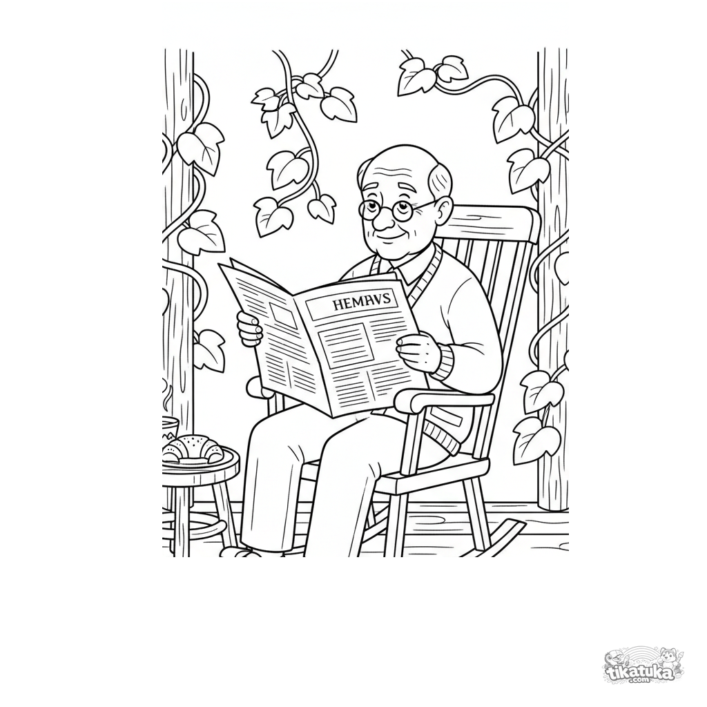 Página para colorear para niños 7-9 años: un abuelo lee el periódico en una mecedora en un porche acogedor. Detalles: taza de té, pastel, enredaderas.