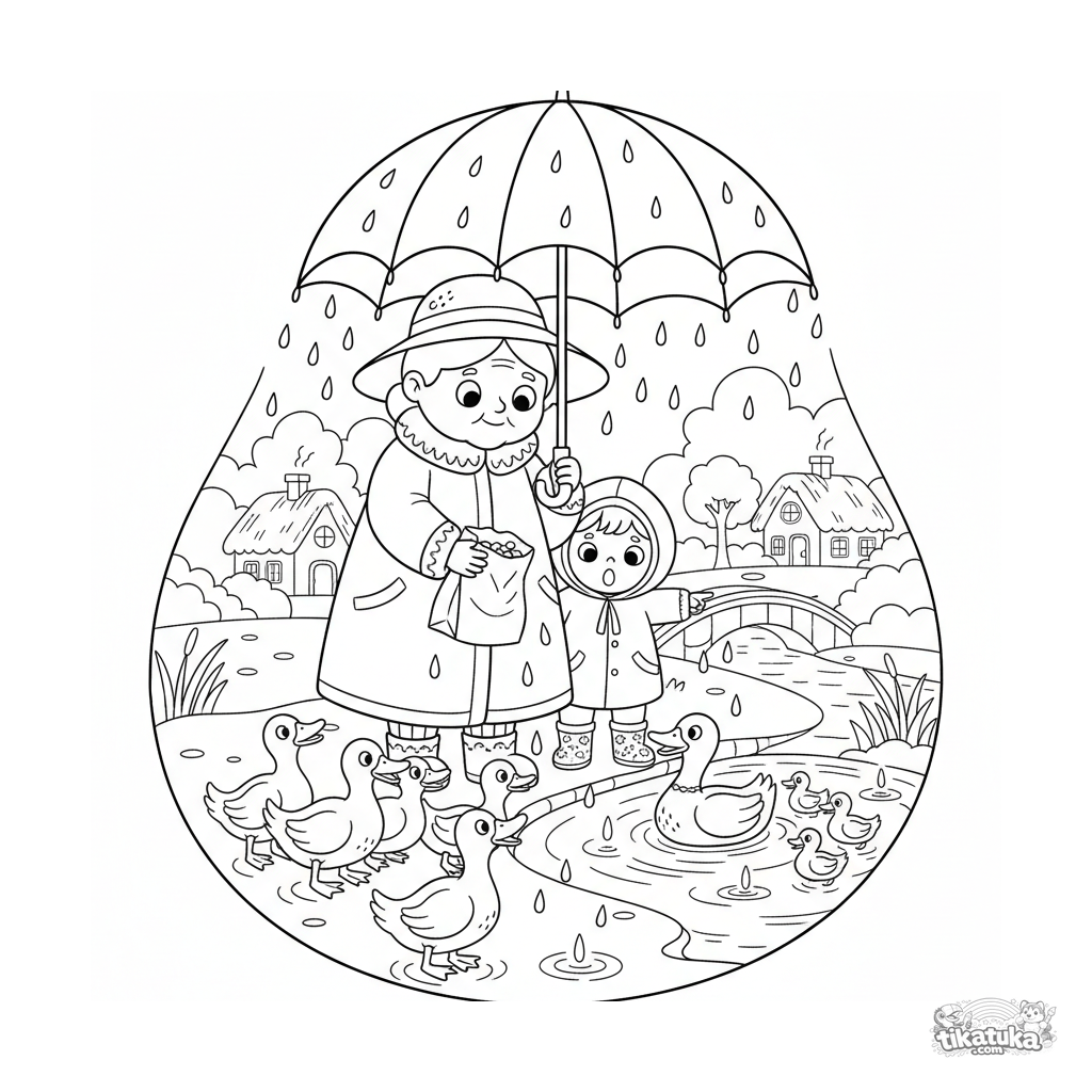Página para colorear para niños de 4-6 años: un abuelo con paraguas y un niño con botas alimentan patos en un estanque de otoño bajo la lluvia. Estilo folclórico.