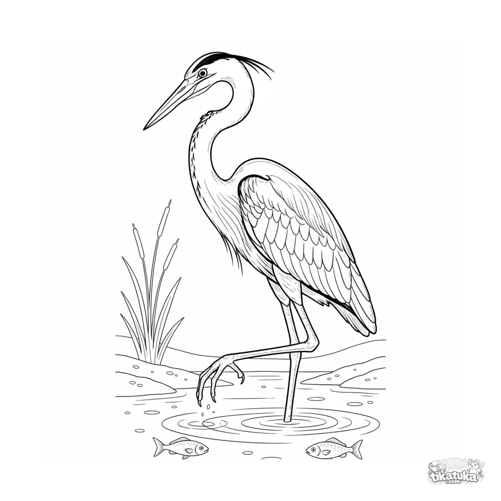 Página para colorear intrincada para niños mayores 10-12: una garza azulada detallada está inmóvil en el arroyo claro y poco profundo, cazando peces. Estilo naturalista.