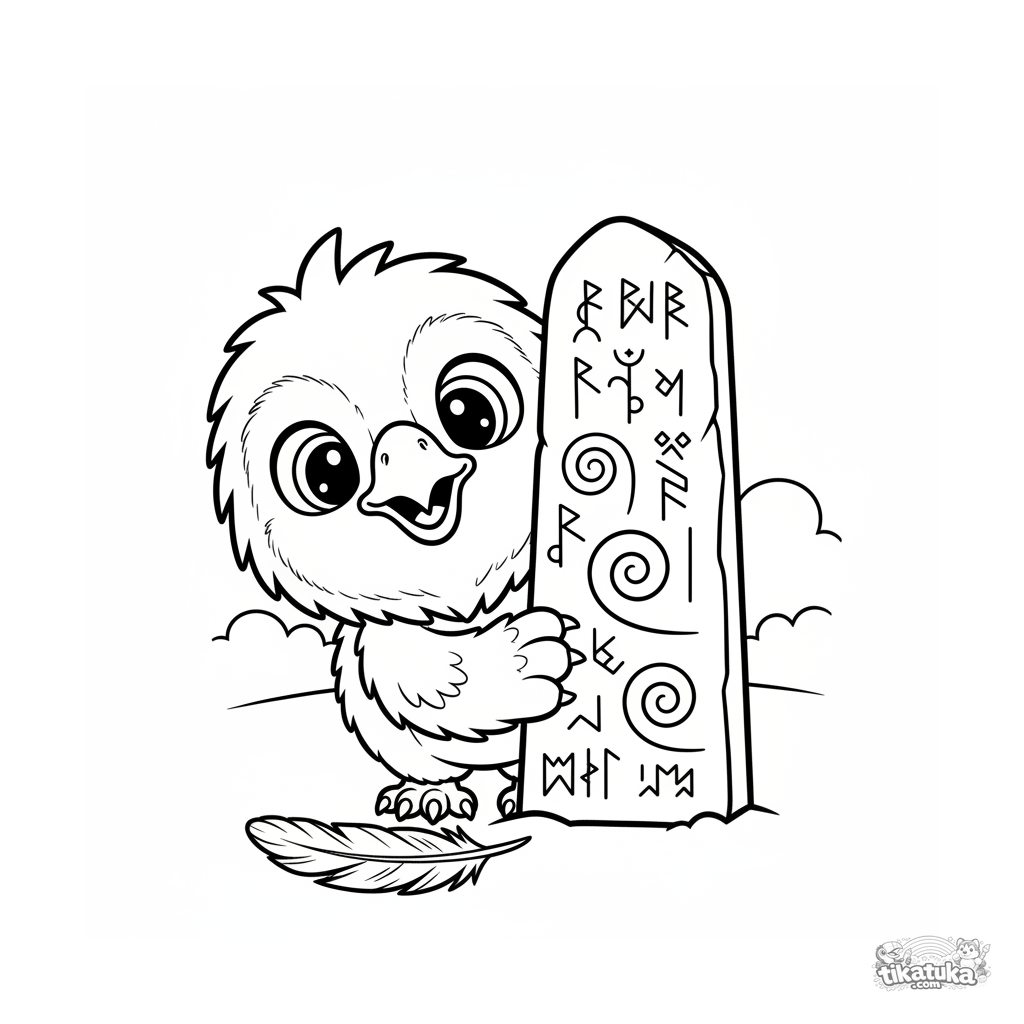 Página para colorear para niños 4-6: un esponjoso polluelo de grifo se asoma con curiosidad tras un antiguo monolito rúnico. Contornos claros.